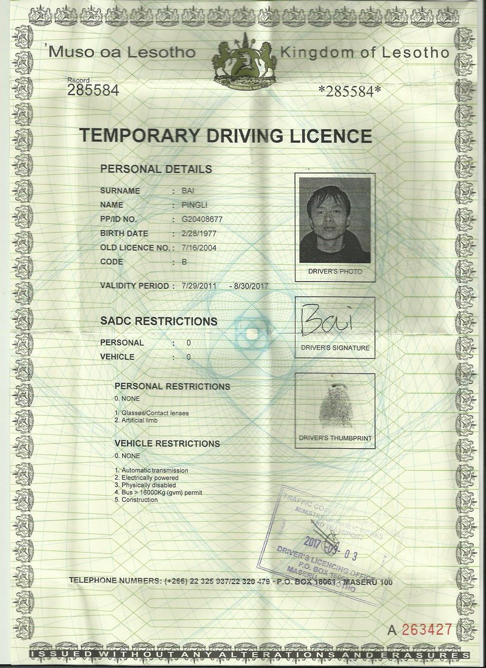 萊索托駕照翻譯模版-咸陽外籍駕照翻譯中心